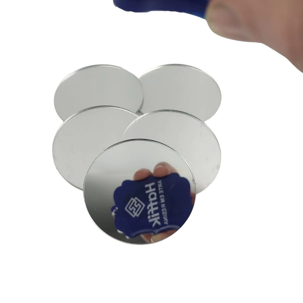 Acrílico Espelhado no formato Redondo. Tamanho: 6cm de diâmetro com 2mm de espessura. Pacotes com 5 unidades.
