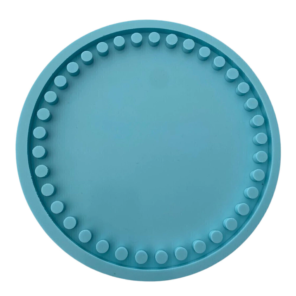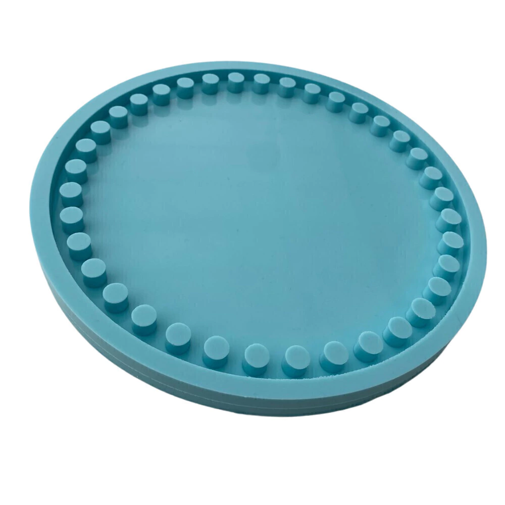 Molde de silicone para resina base bolsa circulo, perfeito para confeccionar lindas bolsas personalizadas. Esse molde possui as medidas de 20cm de diâmetro e 0,8 de profundidade, com 37 furos de 9mm.