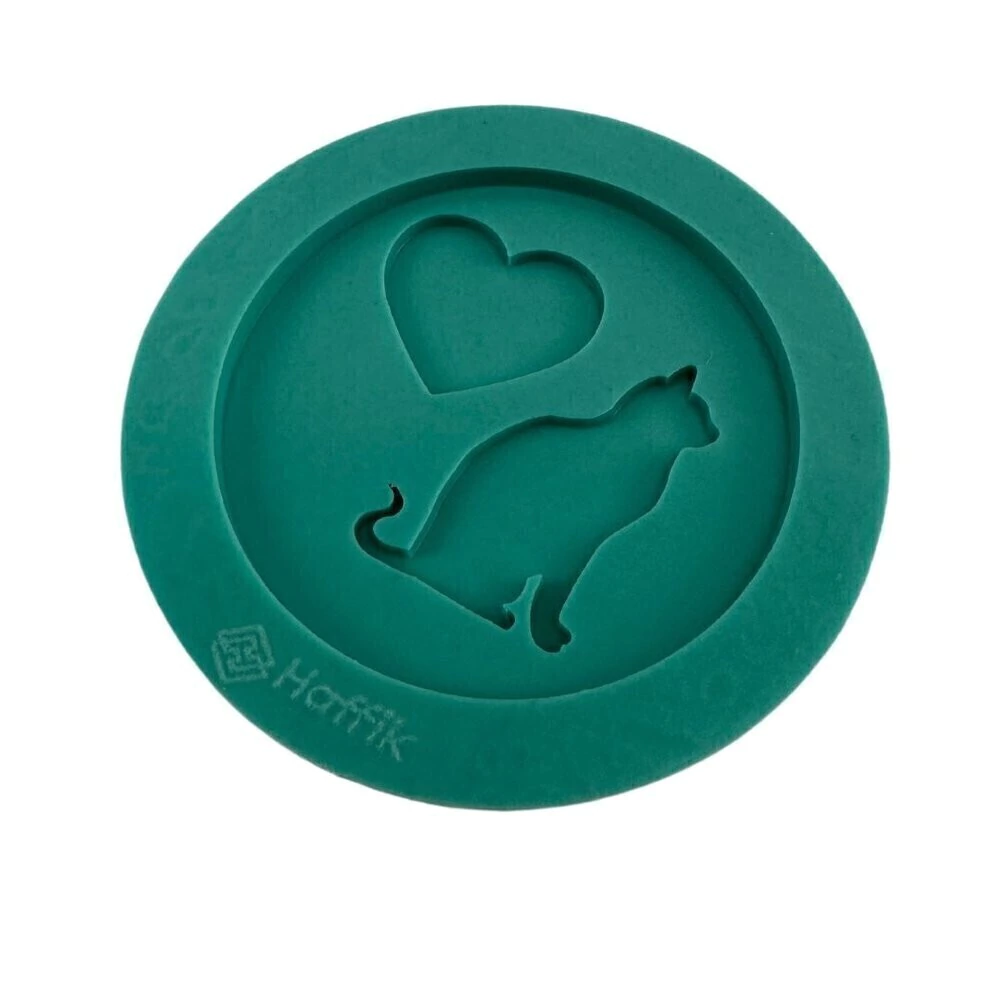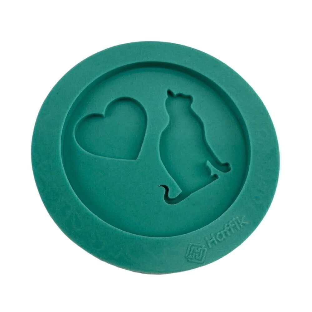 Molde para chaveiro 3D com coração e gatinho, com tamanho de 5 cm de diâmetro e 7mm de espessura total.